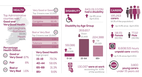 643,131 people, 13.5% of the population, indicated that they had a disability while the number of carers (people providing regular unpaid help for a friend/family member) increased by 8,151 (4.4%) to 195,263.